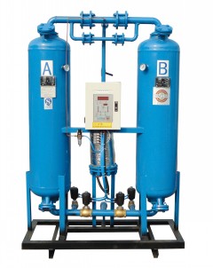 微熱再生壓縮空氣干燥機(jī),綜合變壓吸附和變溫吸附之優(yōu)點(diǎn),在常溫高蒸汽分壓下吸附(工作);在較高溫度,低蒸汽分壓下解析(再生),即吸附劑在吸附過程中吸附水份,在再生過程依靠高品質(zhì)再生氣(加熱干燥的空氣)的熱擴(kuò)散和低分壓兩種機(jī)理的共同作用而得以完全清除。